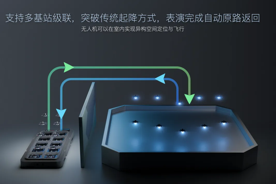 配套的智能收纳箱系统解决了另一个教学痛点:组织效率。每个收纳箱容纳 10 台飞机,置入即自动充电、自动编号,最快 30 分钟充满,全程无需手动配置。30 台的基础配置用 3 个收纳箱承载,课前 10 分钟内完成布场,课后回收同样简便,教学组织成本大幅降低。支持多基站级联,可随集群规模持续扩展。