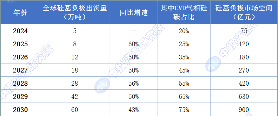 硅基负极是固态电池负极材料升级的核心方向。EVTank预计,全球硅基负极出货量将从2024年的5万吨增长至2030年的60万吨,年均复合增长率达57%。从技术路线来看,目前硅基负极以硅氧为主(2024年占比超70%),而CVD新型气相硅碳负极由于具有更低的体积膨胀和更长的循环寿命,其出货量占比预计将从2024年的20%提升至2030年的75%以上,成为硅基负极的主流技术路线。硅基负极市场空间将从2024年的75亿元增长至2030年的900亿元,增长11倍。