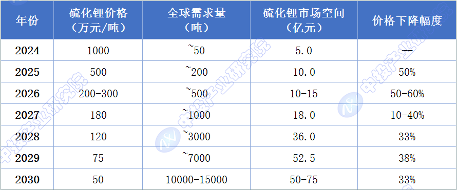 图表14:2024-2030年硫化锂价格下降曲线与市场空间