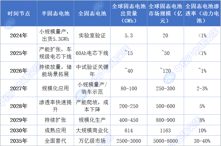 图表4:2024-2035年固态电池产业化时间表与市场规模预测