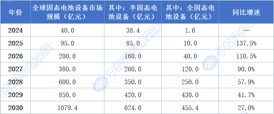EVTank数据显示,2024年全球固态电池设备市场规模为40.0亿元,其中半固态电池设备38.4亿元,全固态电池设备仅1.6亿元(主要为实验室中试线)。随着2025-2026年固态电池中试线建设高峰来临、2027年GWh级量产线落地预期升温,设备市场规模将进入高速增长期。预计到2030年,全球固态电池设备市场规模将达到1079.4亿元,其中全固态电池设备占比将提升至42%以上,年均复合增长率超过70%。