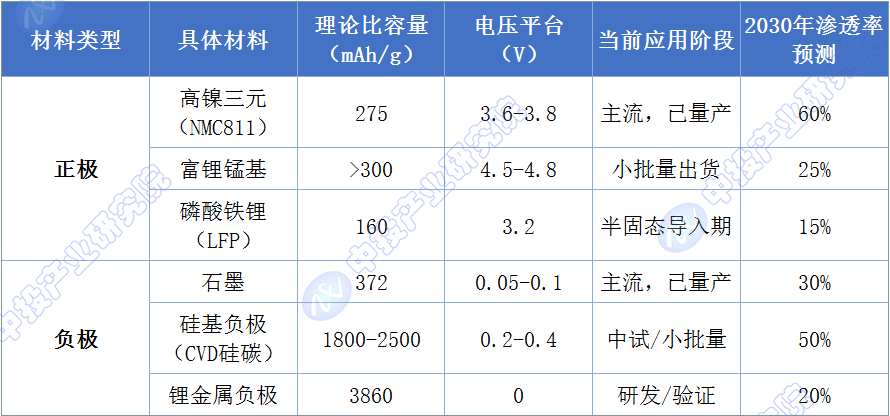 固态电池对能量密度的极致追求,驱动正负极材料体系进行阶梯式升级。传统液态电池中,正负极材料的选择受限于电解液的电化学窗口和界面副反应。固态电解质具有更宽的电化学窗口和更好的化学稳定性,使得更高比容量的正负极材料得以应用。