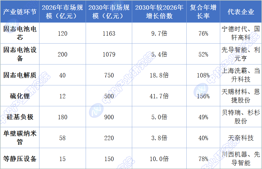 综合各机构预测,固态电池产业链各环节的市场空间将在2026-2030年间实现爆发式增长。从电芯到设备、从电解质到负极材料,每一个环节都将迎来数倍乃至数十倍的成长空间。