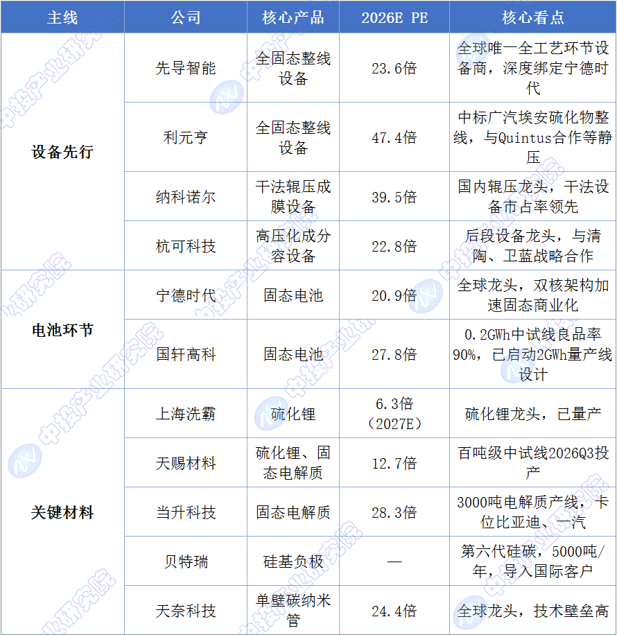 基于对固态电池技术路线、产业化节奏和产业链受益环节的深入分析,我们提出四条投资主线,并筛选出各环节的核心标的。