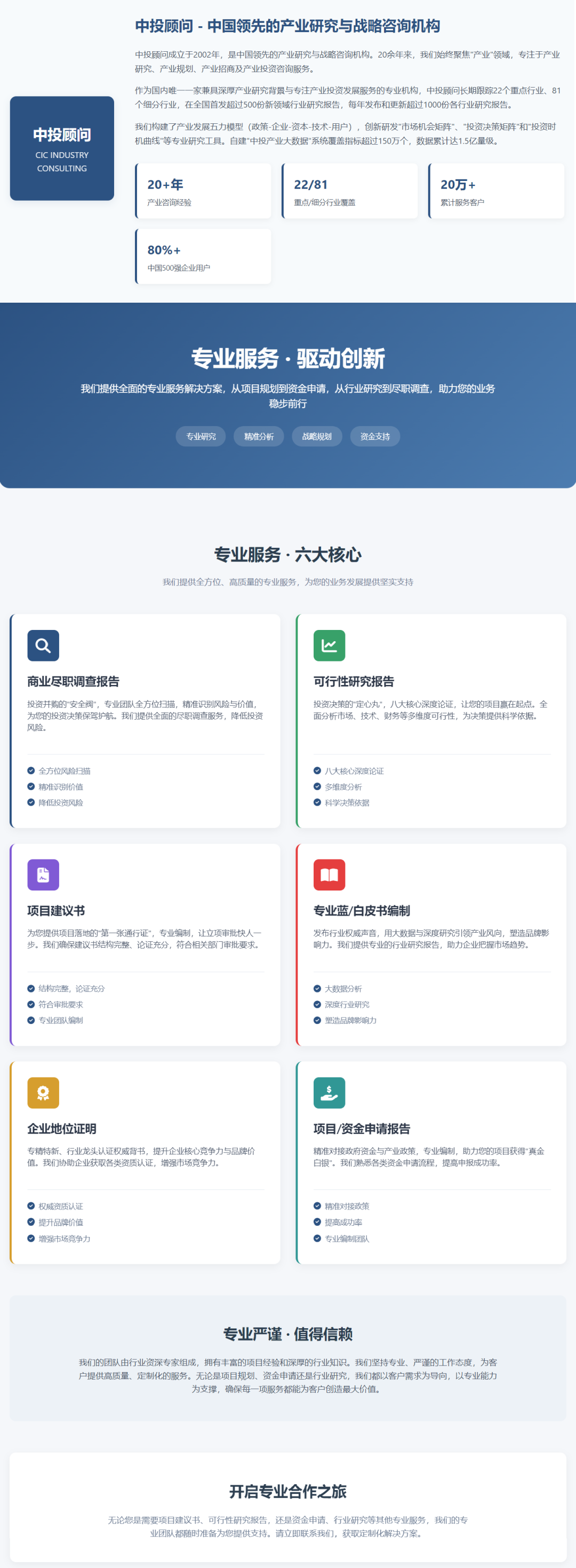 中投顾问长期跟踪22个重点行业、81个细分行业,在全国首发超过500份新领域行业研究报告,每年发布和更新超过1000份各行业研究报告。