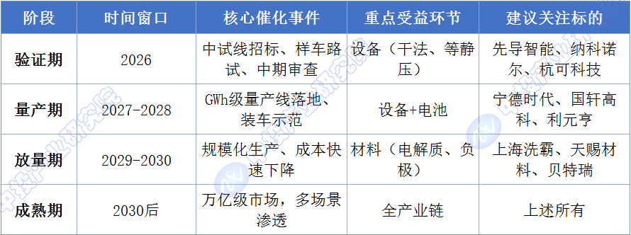 在验证期(2026年),核心催化事件包括中试线招标、样车路试和中期审查,设备环节将率先受益,尤其是干法电极设备和等静压设备。在量产期(2027-2028年),GWh级量产线落地和装车示范将驱动设备订单持续放量,同时电池环节开始贡献收入。在放量期(2029-2030年),随着规模化生产和成本快速下降,材料环节将迎来最大弹性。在成熟期(2030年后),固态电池将进入万亿级市场,全产业链都将受益。
