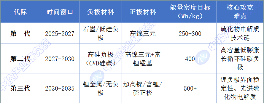 中国科学院院士欧阳明高提出的三代技术路径,清晰地勾勒了全固态电池的演进方向。第一代(2025-2027年)以石墨或低硅负极为主要方向,目标是打通硫化物电解质技术链,实现全固态电池从无到有的突破。这一代产品主要面向长寿命、大倍率应用场景,能量密度虽然仅250-300Wh/kg(与当前高端液态电池相当),但安全性大幅提升,有望在特殊场景(如军工、高端商用车)率先应用。第二代(2027-2030年)以高硅负极为核心,能量密度提升至400Wh/kg,是真正意义上的高能量密度全固态电池,将面向下一代乘用车电池应用。第三代(2030-2035年)以锂金属负极为终极目标,能量密度突破500Wh/kg,将彻底解决续航焦虑问题。
