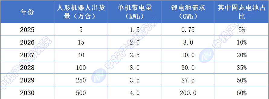 图表10:2025-2030年人形机器人固态电池需求预测