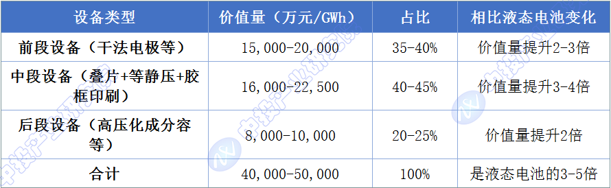 固态电池的产业化进程将首先带动设备环节的需求爆发。与传统液态电池相比,全固态电池的生产工艺发生显著变化:前段从湿法涂布转向干法电极,中段从卷绕+注液转向叠片+等静压+胶框印刷,后段从常规化成分容转向高压化成分容。产线整体更新幅度达80%-90%,单GWh设备价值量高达4-5亿元(液态电池约1亿元)。设备环节凭借高技术壁垒和不可替代性,将成为固态电池产业化进程中最先受益的赛道。
