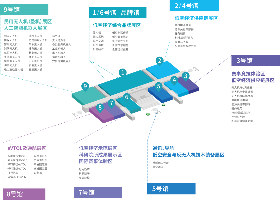 设置七大主题特色展区(点击查看),全面构建低空经济全生态展示矩阵,涵盖低空经济综合品牌展区(1/6号馆)、低空经济供应链展区(2/3/4号馆)、低空安全与反无人机技术装备展区(5号馆)、eVTOL及通用航空展区(8号馆)、民用无人机整机及人工智能机器人展区(9号馆)、赛事竞技体验展区(3/7号馆)以及科研院所成果展示和低空经济示范展区(7号馆),全方位呈现产业前沿成果与创新生态。