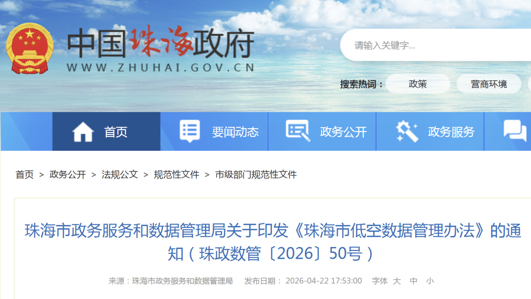 4月22日,珠海市政数局印发《珠海市低空数据管理办法》,旨在加强低空数据规范管理,保障数据安全,促进数据有序流通与合理利用,释放低空数据要素价值,支撑低空经济高质量发展,同时防范潜在风险,确保低空经济持续健康发展。《管理办法》通过构建市级统筹管理机制、明晰各类主体权责、规范覆盖“采集—处理—应用”全链条的精细化管理,统筹处理低空数据“安全可控”与“价值释放”的关系,推动实现规范管理与创新发展的有机统一。《管理办法》包括总则、飞行活动数据管理、安全保障、法律责任和附则共5章21条,主要内容为: