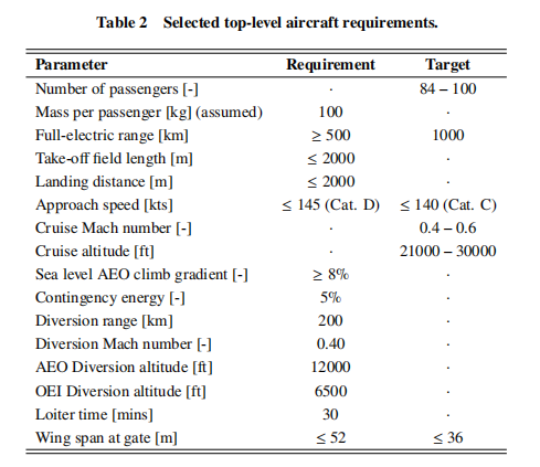 上表给出了为飞机选择的主要飞机性能要求。本表不包括EASA CS-25法规已经规定的性能要求。选择2000米的起飞和着陆距离,使飞机可以在与大多数窄体飞机相同的跑道上运行。将进场速度类别C(<140节)设定为目标,但如果需要,超过此阈值被认为是可以接受的。巡航马赫数和巡航高度经过优化,以最大限度地提高升阻比。为了确保飞机在海平面上也能充分爬升,在所有发动机都工作的情况下,施加了8%的爬升梯度。
