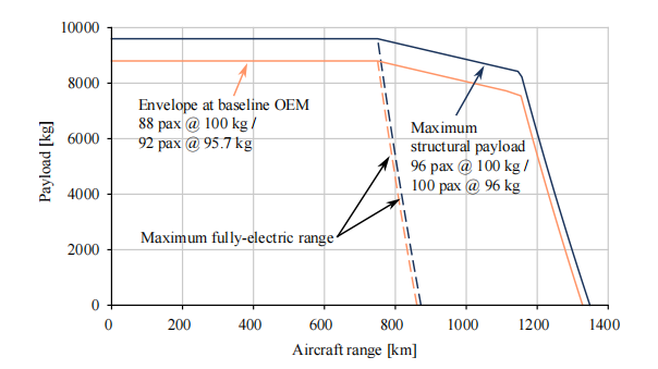 飞机有效载荷范围图,请注意,只有在减少空载质量或电池质量的情况下,才能在不超过MTOM的情况下实现最大结构有效载荷