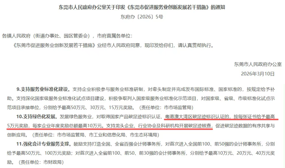 近日,《东莞市促进服务业创新发展若干措施》(下称《若干措施》)印发出台,《若干措施》明确,对取得国家产品碳足迹标识认证、粤港澳大湾区碳足迹标识认证的,按每张证书给予最高5万元奖励,每家企业年度奖励总额最高10万元。政策依据:《东莞市促进服务业创新发展若干措施》第10条——10.支持绿色化发展。发展绿色服务业,对取得国家产品碳足迹标识认证、粤港澳大湾区碳足迹标识认证的,按每张证书给予最高5万元奖励,