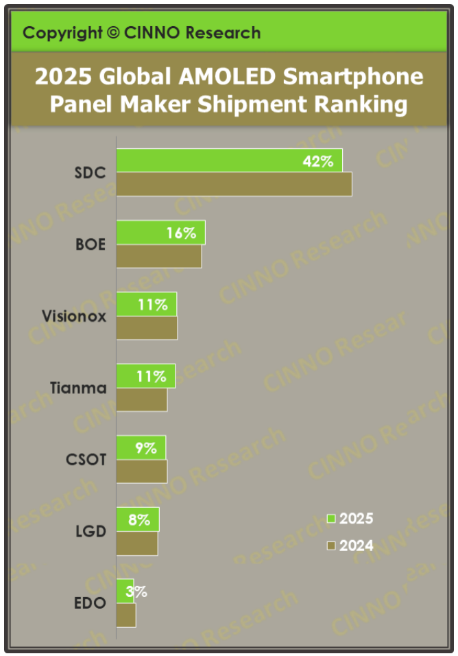 “根据CINNO Research统计数据显示,2025年全球市场AMOLED智能手机面板出货量约9.2亿片,同比增长4.7%,出货量再创历史新高。” 2025年,全球AMOLED智能手机面板市场持续稳健增长。根据CINNO Research统计数据显示,2025年全球市场AMOLED智能手机面板出货量约9.2亿片,同比增长4.7%,出货量再次刷新历史纪录,尽管增速相较前两年有所放缓,但整体仍保持