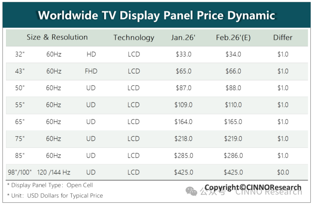 “今年1月,受国外世界杯等国际赛事需求持续释放以及国内补贴政策延续影响,多数面板价格获得支撑,呈现上涨趋势。进入2月,短期需求依然旺盛,同时面板厂在春节期间实施控产,导致市场供应阶段性收紧。在需求保持韧性、供给趋紧的共同作用下,预计2月面板价格将维持温和上涨。” CINNO Research 简评 01 在国外体育赛事以及国内利好政策的推动下,今年一季度电视面板市场短期需求持续回暖,面板厂在今年1