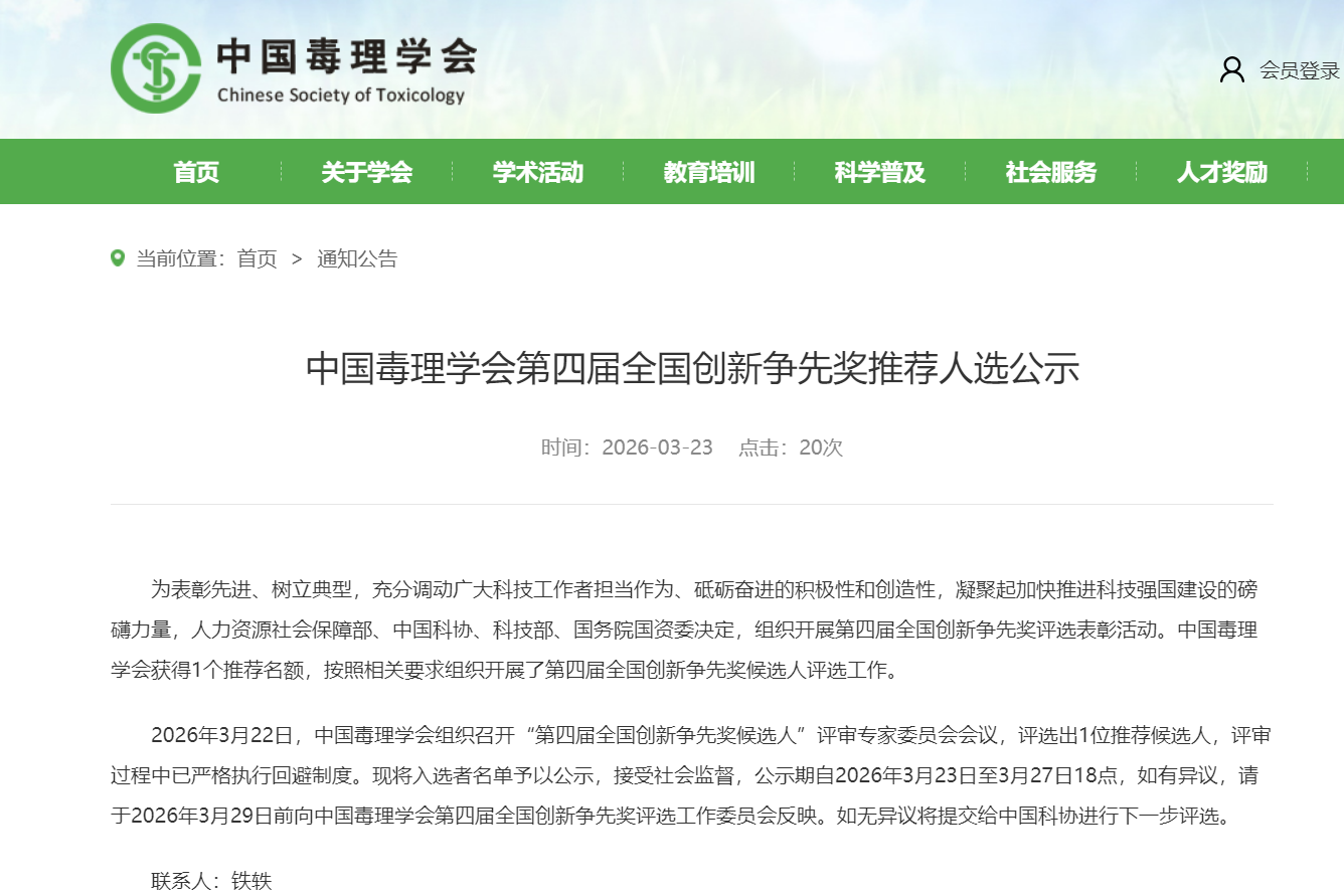 中国毒理学会第四届全国创新争先奖推荐人选公示 为表彰先进、树立典型,充分调动广大科技工作者担当作为、砥砺奋进的积极性和创造性,凝聚起加快推进科技强国建设的磅礴力量,人力资源社会保障部、中国科协、科技部、国务院国资委决定,组织开展第四届全国创新争先奖评选表彰活动。中国毒理学会获得1个推荐名额,按照相关要求组织开展了第四届全国创新争先奖候选人评选工作。 2026年3月22日,中国毒理学会组织召开“第四