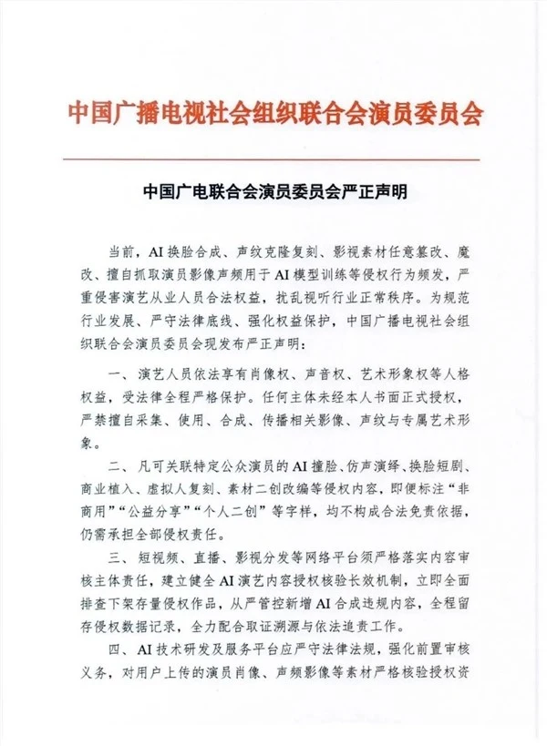 随着AI深度合成技术的普及,未经授权的演员换脸、声纹克隆已成为网络侵权重灾区,严重扰乱影视行业生态。2026年4月2日,中国广播电视社会组织联合会(中广联)演员委员会正式发布严正声明,为AI技术在演艺领域的应用划出不可逾越的法律与行业红线,全面维护演员的肖像权、声音权及艺术形象权。 一、AI侵权乱象频发,演员数字化权益告急 当前,AI换脸、声纹克隆技术门槛持续降低,大量不法主体未经许可,擅自抓取演