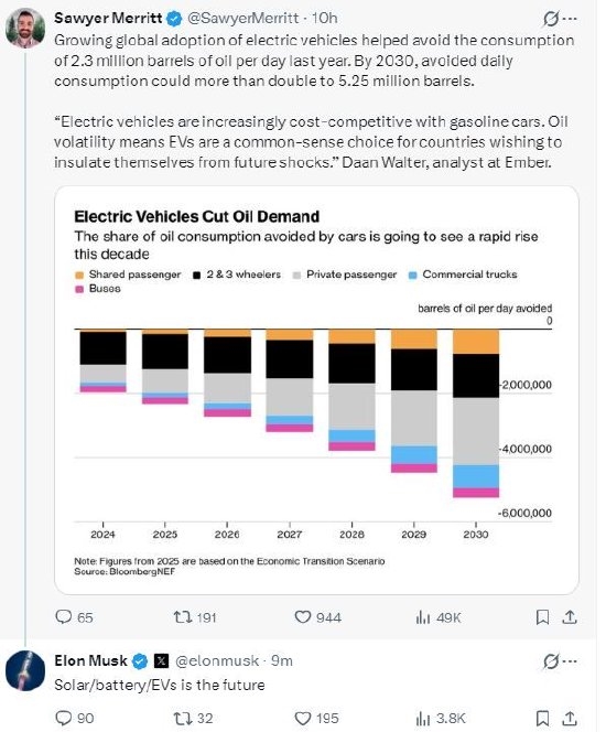 快科技3月24日消息,全球能源转型的大幕正以前所未有的速度拉开。社交媒体上一位用户发文指出,无论欧美局势如何演变,世界向电动汽车转型的趋势已经不可逆转,传统西方车企已无力阻挡这一历史进程。 该观点认为,石油领域频繁波动的地缘政治风险,正在成为加速全球弃油转电的催化剂。特斯拉首席执行官马斯克对此深表认同,并简洁地回应称,这确实是正在发生的事实。 电动汽车分析师索耶·梅瑞特提供的最新数据进一步印证了这