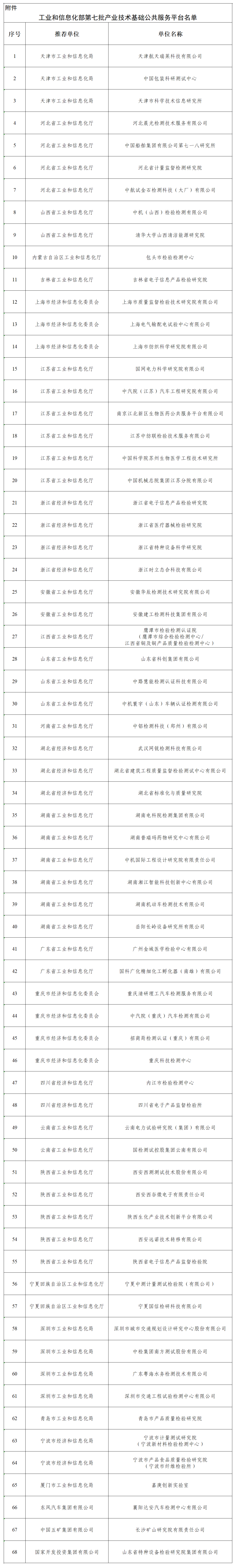 关于公布第七批产业技术基础公共服务平台名单的通知工信部科函〔2026〕74号为进一步提升产业技术基础公共服务能力和水平,健全产业基础支撑体系,根据《工业和信息化部办公厅关于做好第七批产业技术基础公共服务平台申报工作的通知》(工信厅科函〔2025〕527号),经评审和公示,确定天津航天瑞莱科技有限公司等68家单位为工业和信息化部第七批产业技术基础公共服务平台(见附件),现予以公布。列入名单的单位要持