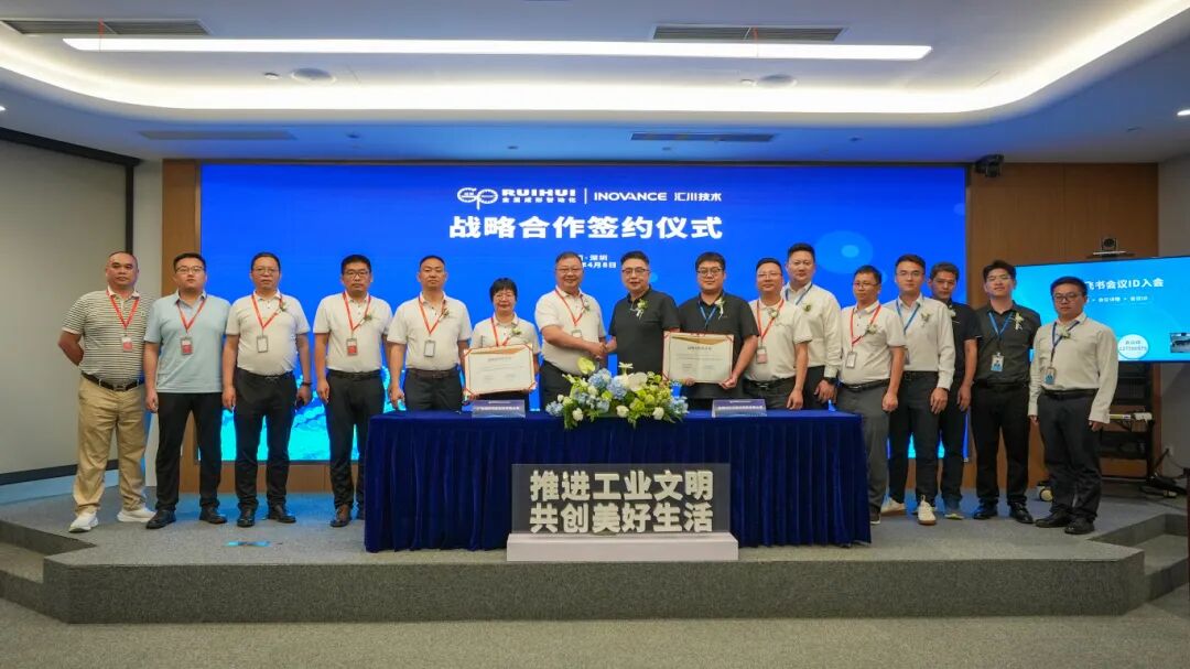 近日,汇川技术与广东瑞辉智能科技有限公司(以下简称“瑞辉智能”)在汇川深圳总部正式签署战略合作协议。此次强强联合,标志着双方资源、技术与战略的深度融合,携手产业链伙伴,共同开创汽车装备智能制造高效、精益、可持续发展的新未来。汇川技术董事长、总裁朱兴明,工业自动化(中国)华南总监刘忠旭,产品竞争力中心SPDT主任郭福坤,全球行业管理中心汽车行业总经理倪高峰,华南区域汽车军团总经理贺伟;瑞辉智能董事长