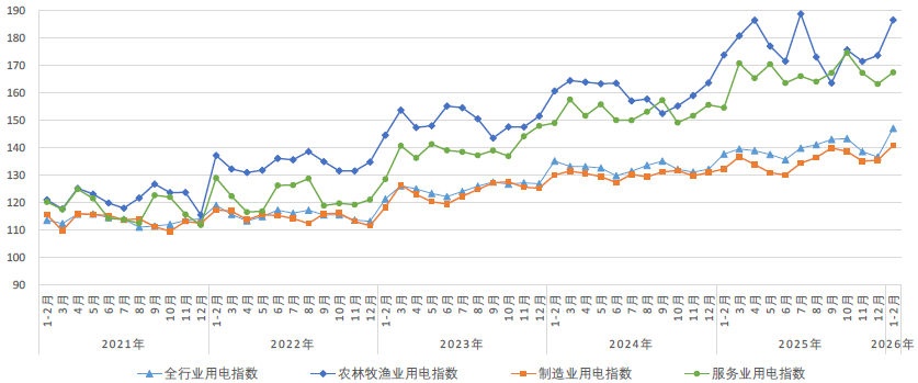 2026年1-2月,全国全行业用电指数为147.0,全行业用电量比2020年基期(以2020年基期为100)增长了47.0%,年均增长6.6%,同比增长6.8%,增速比上年12月提高3.4个百分点。
