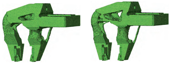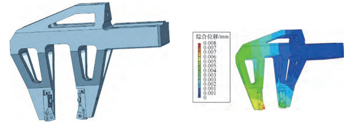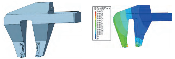根据拓扑优化的计算结果、刀具使用工况和刀架制造工艺性对刀架进行了轻量化设计,优化前、后的车刀模型和刀尖处位移如图4所示,使之不超出车床对刀具质量的限制。优化后的刀具质量由22kg降低至16.6kg,减重24.5%;左侧刀尖处综合位移由0.006mm增加至0.008mm,仍能满足制动器托板的加工精度要求。