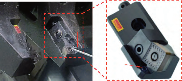 优化前后的刀具实物如图5所示,刀夹如图6所示。左、右两侧的刀尖距离根据制动器托板设计厚度确定,可通过刀夹侧面调整螺钉(图6中红色箭头标识处)对其进行微调,以保证加工尺寸精度。