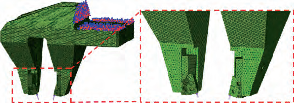 车刀有限元模型如图1所示,刀具模型由刀架、刀夹和刀片三部分组成,三者均为钢材,材料参数如下:弹性模量E=210000MPa,密度ρ=7850kg/m3,泊松比υ=0.295[1]。刀架和刀夹、刀夹和刀片之间的配合面采用绑定约束,限制刀架水平和竖直安装面6个方向的自由度。在左、右刀片的主切削刃区域施加大小相同的车削反力,车削反力[2]Ff的计算公式为
