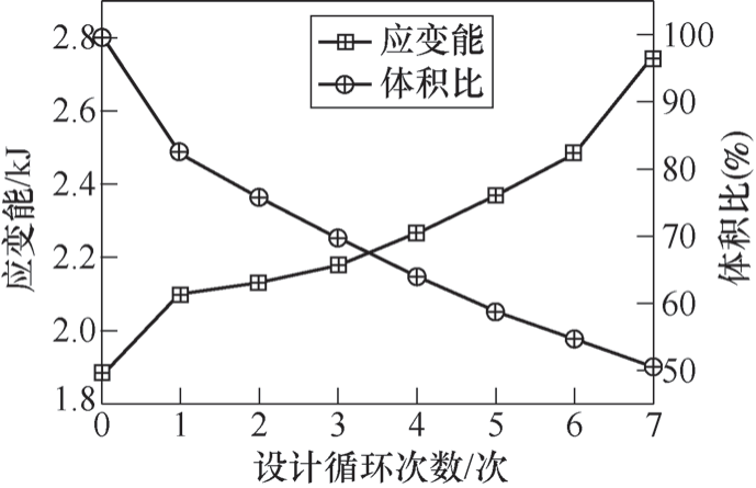 a)初始状态体积比100% b)3个设计循环后体积比70%