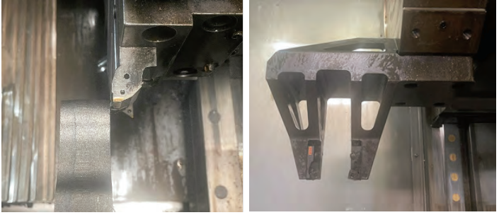 优化前后的刀具实物如图5所示,刀夹如图6所示。左、右两侧的刀尖距离根据制动器托板设计厚度确定,可通过刀夹侧面调整螺钉(图6中红色箭头标识处)对其进行微调,以保证加工尺寸精度。