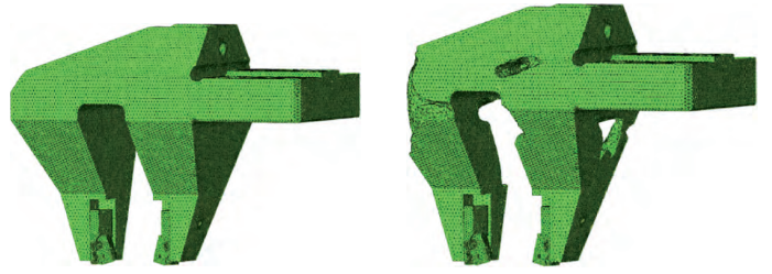 根据拓扑优化的计算结果、刀具使用工况和刀架制造工艺性对刀架进行了轻量化设计,优化前、后的车刀模型和刀尖处位移如图4所示,使之不超出车床对刀具质量的限制。优化后的刀具质量由22kg降低至16.6kg,减重24.5%;左侧刀尖处综合位移由0.006mm增加至0.008mm,仍能满足制动器托板的加工精度要求。
