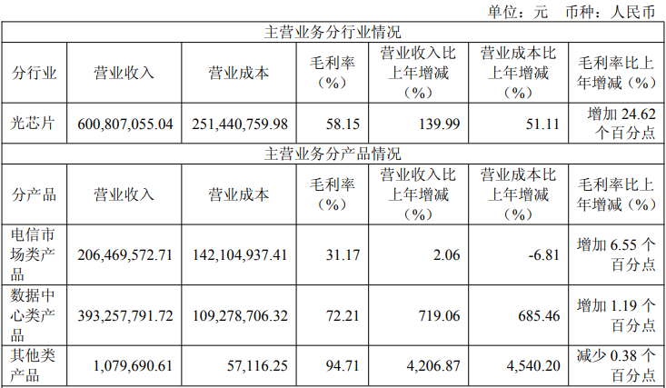 据公告显示,源杰科技2025年实现营收6.01亿元,同比增长138.50%;归母净利润1.91亿元,同比扭亏为盈。此前在源杰科技的业绩快报中,笔者就曾分析过,其2025年营利激增,核心在于人工智能产业进入爆发期,大模型训练推理对算力的需求呈指数级增长,从而拉动了光芯片需求增长,由此推动源杰科技数据中心业务收入增长,该产品属高毛利且是现阶段供不应求的产品,使得源杰科技去年净利润同比激增,实现扭亏为盈。具体来看,源杰科技聚焦于光芯片行业,主要产品为光芯片,广泛应用于电信市场、数据中心市场、车载激光雷达市场等领域。在当下最为火热的光通信领域中,源杰科技主要产品包括2.5G、10G、25G、50G、100G、200G以及更高速率的DFB、EML激光器系列产品和50mW、70mW、100mW等大功率硅光光源产品,主要应用于光纤接入、4G/5G移动通信网络和数据中心等领域。2025年,源杰科技电信市场业务实现收入20646.96万元,同比增加2.06%;数据中心业务实现收入39325.78万元,同比增加719.06%,该业务收入占比超50%,产品毛利率高达72.21%,是源杰目前最核心的增长点。针对高速光模块需求,源杰科技CW 70mW激光器芯片实现批量出货,这也是数据中心业务的主要产品。值得一提的是,数据中心市场需求体量大,但下游客户相对较少,加上光芯片对于产品性能和品质的要求非常高,通常需要经过长期验证才能逐步进入下游供应链。因此,源杰科技去年数据中心业务收入大幅增长、占比过半,导致其2025年客户结构较为集中。源杰科技2025年的第一名客户、第二名客户均为该领域厂商,第三到五名客户均属电信市场。显然,源杰科技充分享受了AI产业爆发所带来的红利,其在年报中亦有提及后续将聚焦聚焦800G、1.6T等高速率光模块,以及NPO、CPO等新兴封装路线需求,加大更高功率CW光源、高速EML激光器研发与商业化落地力度。面对当下国内外头部云厂商、通信运营商持续加大算力基础设施建设投入力度,高速光模块需求激增,尤其是光芯片现阶段供不应求,部分企业的订单甚至排到2028年的情况,光芯片厂商相继宣布扩产计划。源杰科技亦是如此,其于今年2月公告,拟约12.51亿元投建光电通讯半导体芯片和器件研发生产基地二期项目(下称“光电通讯二期项目”),项目周期18个月,以此匹配市场增长需求。同时,公司也将加大数字化投入,推动智能制造全流程应用,实现生产自动化、可视化管控,提升运营效率及品质稳定性。此外,源杰科技现阶段也正计划在境外发行境外上市股份(H股)并申请于香港联合交易所有限公司主板上市。从宁德时代的 “宁王”,到寒武纪的 “寒王”,A股的产业浪潮永远在孕育新的王者。AI时代的算力洪流奔涌向前,手握光芯片核心密钥的源杰科技,正以技术为帆、产能为桨,在AI这条黄金赛道上勇立潮头,或许属于“源王”的征程,才刚刚启幕。