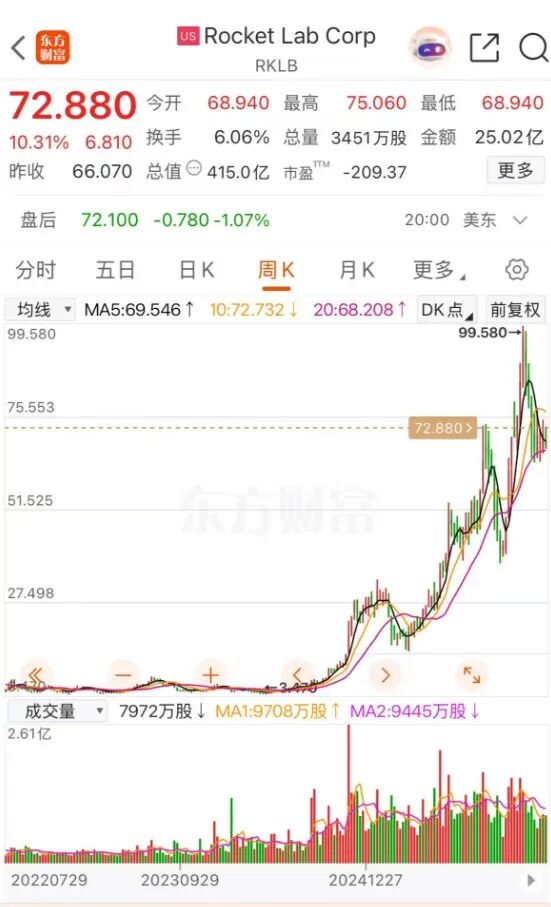 那时候我顺便看了一下Rocket Lab的K线走势,就想,这么好的公司,市值才20亿美元出头,真的是好标的啊。