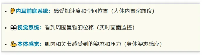 要理解这一点,我们首先需要弄清楚:人为什么会晕车?在医学界,晕车叫作“晕动症”,它的核心解释被称为“感觉冲突论”。简单来说,我们的大脑为了维持平衡,同时接收了三路信号: