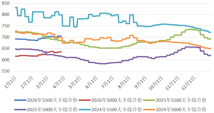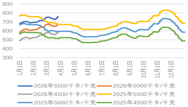 国内煤炭主产地方面,本周市场呈现“产地供应高位维稳,非电需求持续释放”的总体特征。临近月末,内蒙古、陕西等地部分已完成月度生产任务的煤矿有减产或停产检修计划,市场供应增量受到一定限制。火电日耗季节性转淡,终端对高价煤接受度有限;但化工、冶金、水泥等非电行业开工率持续回升,补库需求旺盛,成为支撑产地价格的关键因素。整体而言,在非电需求与看涨预期推动下,本周主要产区坑口价格累计涨幅5-20元/吨,但后半周高价已对需求产生抑制,市场上涨动能减弱,供需宽松的基本格局并未发生根本改变。