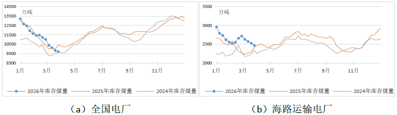 燃煤电厂生产方面,本周电厂发电量和耗煤量呈“总量下降、区域分化”特征,北方区域及内陆电厂季节性回落;南方区域及沿海电厂则因风光电出力不足、气电出力下降、企业抢“出口期”等原因,反季节性走高。根据中电联电力行业燃料统计数据,本周(3月20日至3月26日,下同),纳入统计的燃煤发电企业日均发电量环比(3月13日至3月19日,下同)减少2.4%,同比增长18.0%;其中华北区域环比下降12.7%;日均供热量600万吉焦,环比减少34.0%,同比增长6.6%。日均耗煤量环比减少4.2%,同比增长16.4%;其中华北区域环比下降14.7%、西北区域环比下降11.6%。电厂库存量较3月19日减少125万吨,库存可用天数20天。海路运输电厂日均发电量环比增长1.6%,同比增长32.1%;日均供热量减少12.6%,同比增长10.9%;日均耗煤量环比增长1.8%,同比增长29.8%;电厂库存量较3月19日减少53万吨,库存可用天数17.4天。
