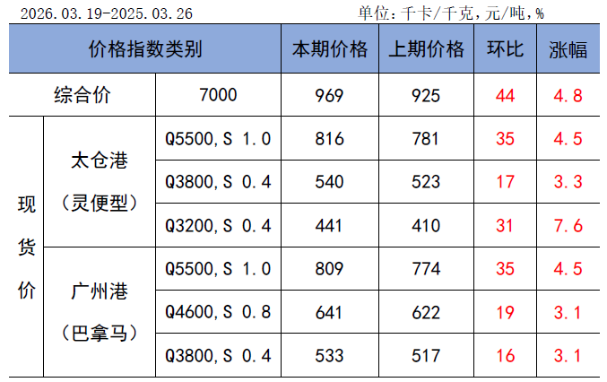 CECI进口指数到岸标煤单价为969元/吨,较上期上涨44元/吨,环比涨幅4.8%。本期各煤种采购价格均有不同程度上涨,其中太仓港(灵便型)5500千卡/千克、广州港(巴拿马型)5500千卡/千克价格环比分别上涨35元/吨、35元/吨。本周进口煤现货市场呈现“需求小幅释放,成交有限”的特征。随着国内煤炭市场价格持续走高,进口煤价格倒挂情况有所改善,终端维持刚需采购。从招标情况来看,本周流标量同样处于高位,终端对于高价煤接受程度不高。从交货期看,本周样本交货期主要集中在4月中旬。