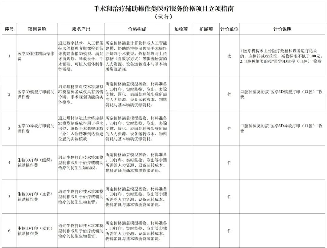 2026年1月,国家医保局印发《手术和治疗辅助操作类医疗服务价格项目立项指南(试行)》,首次在国家层面为医学3D打印设立了明确的收费名目。