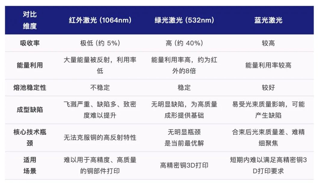 金属3D打印技术因其能直接成型复杂几何形状的优势,天然适合轻量化拓扑结构和一体化集成设计,突破传统液冷制造瓶颈。但传统红光因铜高反难题、成型缺陷,难以应用,而绿光SLM技术凭借底层光学原理突破,成为铜液冷打印的“最优解”。