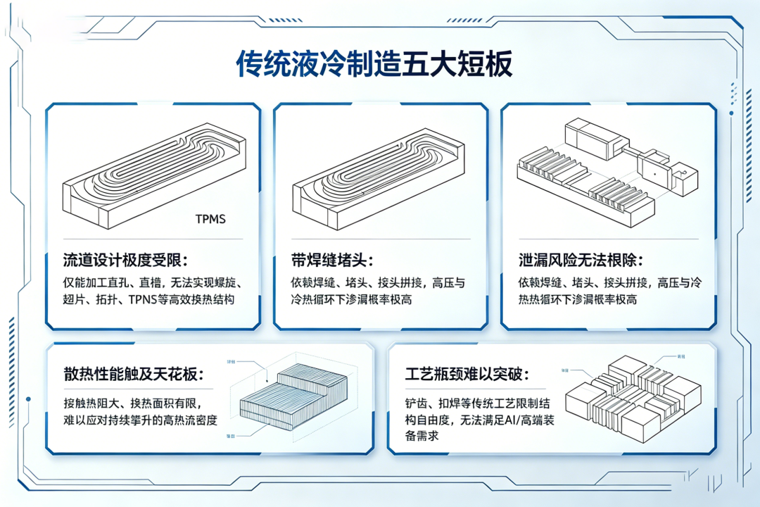 传统液冷板制造以铲齿、真空钎焊为主,在结构自由度、微通道精度、换热密度及可靠性上存在明显瓶颈,且必须依赖焊接密封,存在泄漏隐患,在AI、新能源等高热流密度场景下,无法满足高性能、高集成、高可靠性的液冷散热需求。