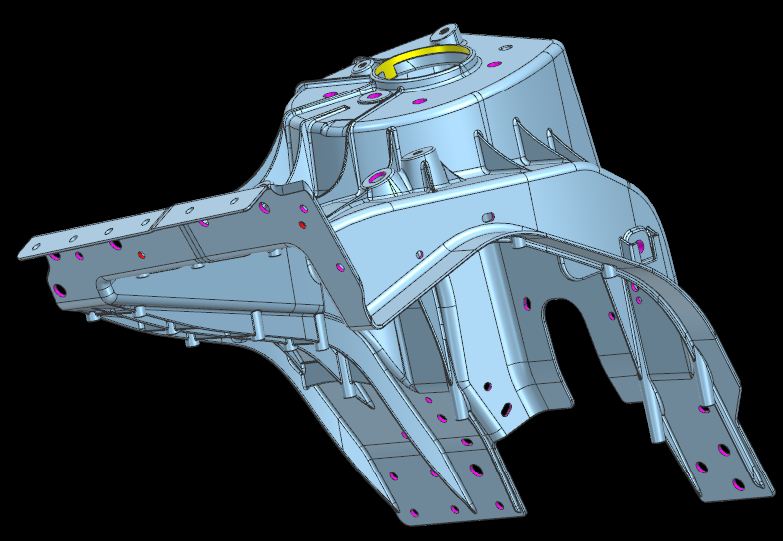 本工件为广汽某车型左前轮罩,来自文灿集团,材质为A360压铸铝,尺寸488.95mm×412.91mm×556.05mm。工件结构复杂,包含各类光孔、螺纹孔、U型槽等特征共计69处。