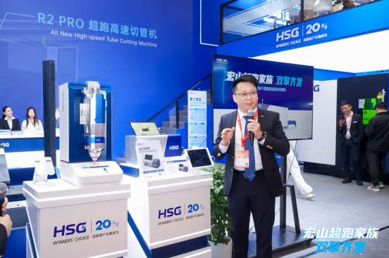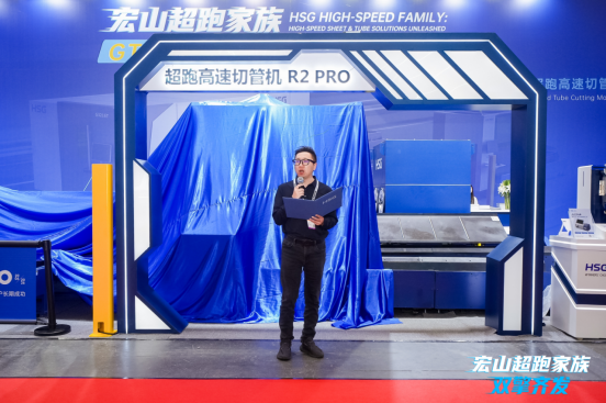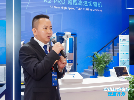随后,宏山激光智能管切事业部产品经理李康池对R2 PRO超跑高速切管机进行了详细剖析。他表示:“当前中型管材加工在效率与精度方面仍存在限制,整体成本较高,高速度与高精度已成为激光切管机的核心需求。”宏山R2 PRO高速切管机顺势而出,以高速度、高精度、高稳定性重新定义激光切割设备性能标杆,为客户提供更高效、更稳定的解决方案。