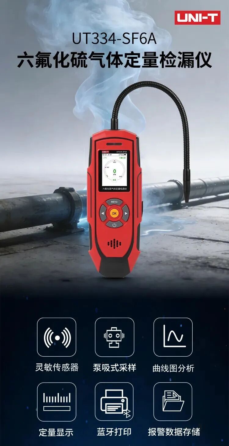 UT334-SF6A六氟化硫气体定量检漏仪是一款便携式专业检测设备,集精准定量、智能便捷与防爆安全于一体,适用于电力、化工、环保等领域的设备检漏与环境安全监测。