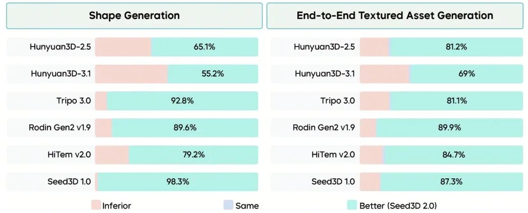 字节跳动招募了 60 位具有 3D 建模经验的人类打分员,对Seed3D 2.0 和六个主流模型的生成质量进行两两盲评对比。