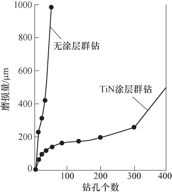 温松明等[3]针对涂层技术提升传统高速钢群钻耐磨性的问题,开展了TiN涂层高速钢群钻的寿命对比试验。结果表明:TiN涂层群钻的平均钻孔数达548.4个,而无涂层群钻仅为52.7个,寿命提升约10倍。研究指出,TiN涂层的高硬度、高温稳定性和化学惰性有效保护了刃带,显著抑制了摩擦磨损与粘结磨损;相比之下,无涂层钻头因刃带快速磨损形成犁沟,导致早期贯穿失效。该工作验证了TiN涂层在群钻上显著的增寿效果,为涂层刀具在难加工材料钻削中的应用提供了试验依据。无涂层与TiN涂层的群钻磨损曲线对比如图3所示。
