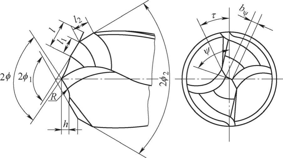 张笑维[12]针对42CrMo合金钢深孔钻削中存在的轴向力大、排屑困难、刀具磨损快等问题,设计并试验了一种基于“三尖七刃”结构的新型硬质合金深孔麻花钻。该钻型通过在后刀面磨出月牙槽,形成内刃、圆弧刃与外刃,显著缩短横刃长度,并优化了各切削刃的几何参数(如外刃峰角110°、尖高0.32mm及圆弧半径0.57mm)(见图16)。