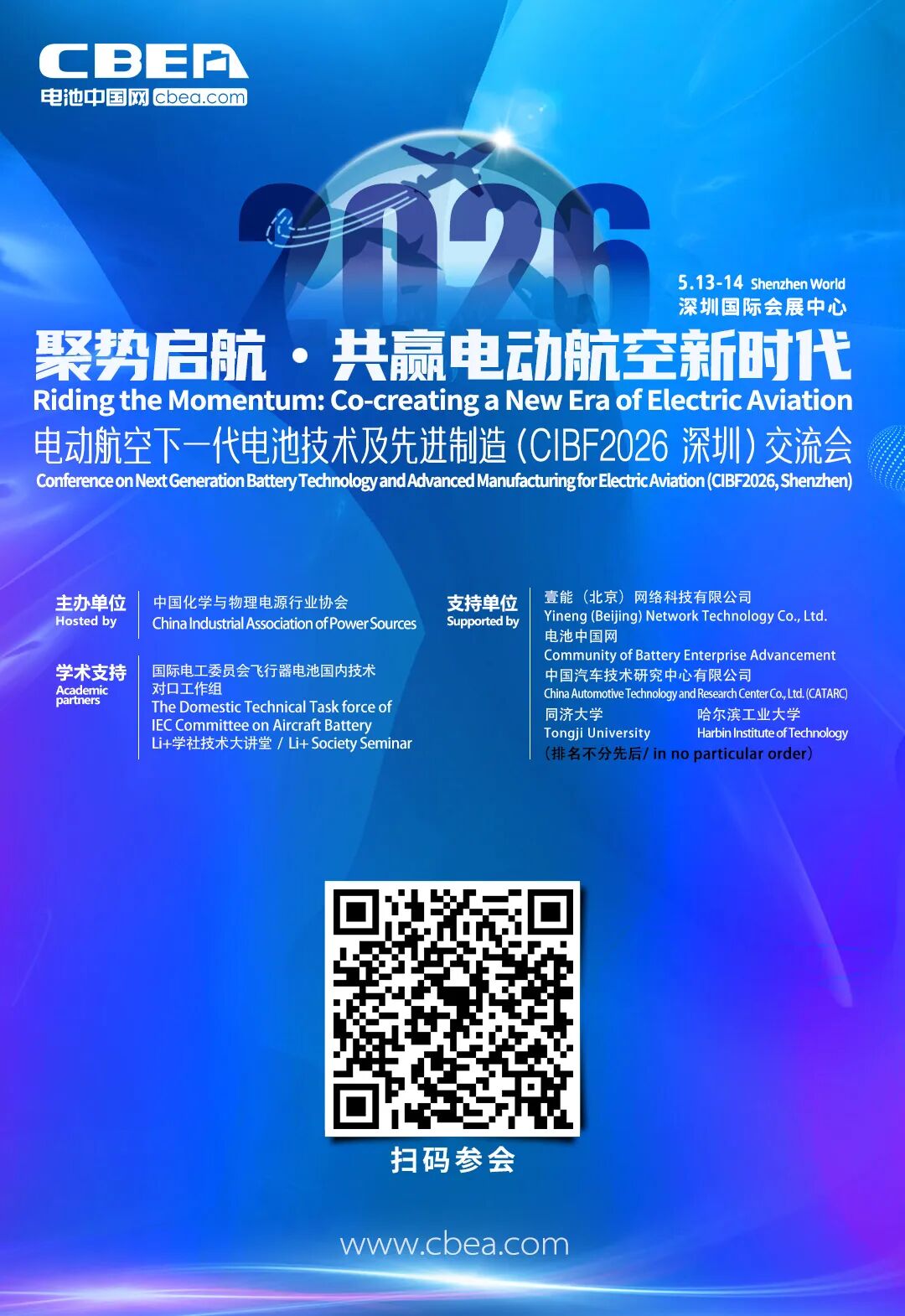 2026年5月13-14日,由中国化学与物理电源行业协会主办、壹能(北京)网络科技有限公司、电池中国网、中国汽车技术研究中心有限公司、同济大学能源与汽车学院、哈尔滨工业大学电化学工程系提供支持的“电动航空下一代电池技术及先进制造(CIBF2026深圳)交流会”,将在深圳召开。
