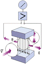 基于法拉第电磁感应定律。当导电液体流经测量管时,切割磁力线感应出电动势 E。电动势 E 与磁通量密度 B、测量管内径 d 与平均流速 u 成正比。