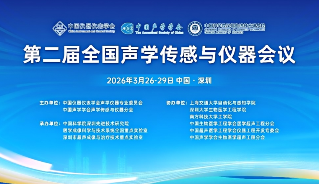 2026年3月26日-29日 | 中国 深圳各相关单位和专家:中国仪器仪表学会声学仪器专业委员会和中国声学学会声学传感与仪器分会定于2026年3月26 - 29日在深圳市登喜路国际大酒店联合举办“第二届全国声学传感与仪器会议”。会议依托中国中国科学院深圳先进技术研究院、医学成像科学与技术系统全国重点实验室、深圳市超声成像与治疗技术重点实验室承办,上海交通大学自动化与感知学院、深圳大学生物医学工程学